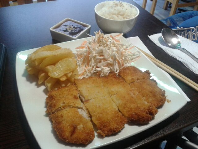 Una sabanita de cerdo empanizada con Panko, acompañado por ensalada de col y al cual le han dado un toque personal con papas fritas de guarnición,  es la resolución ideal para un almuerzo tardío que casi se convierte en lonche 🙂